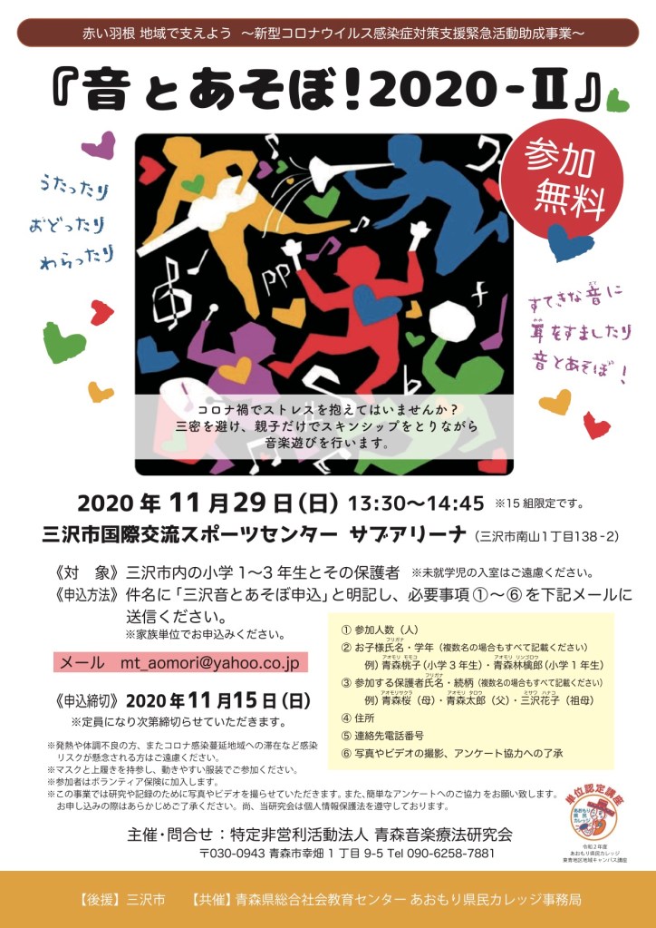 音とあそぼ!2020-II in 三沢 投稿日: 2020年9月19日 投稿者: aomorimta 共有: クリックして X で共有 (新しいウィンドウで開きます) X Facebook で共有するにはクリックしてください (新しいウィンドウで開きます) Facebook いいね 読み込み中… 関連