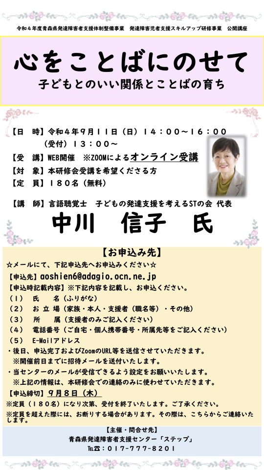 発達障害児者支援スキルアップ研修事業公開講座 投稿日: 2022年7月29日 投稿者: aomorimta 共有: クリックして X で共有 (新しいウィンドウで開きます) X Facebook で共有するにはクリックしてください (新しいウィンドウで開きます) Facebook いいね 読み込み中… 関連